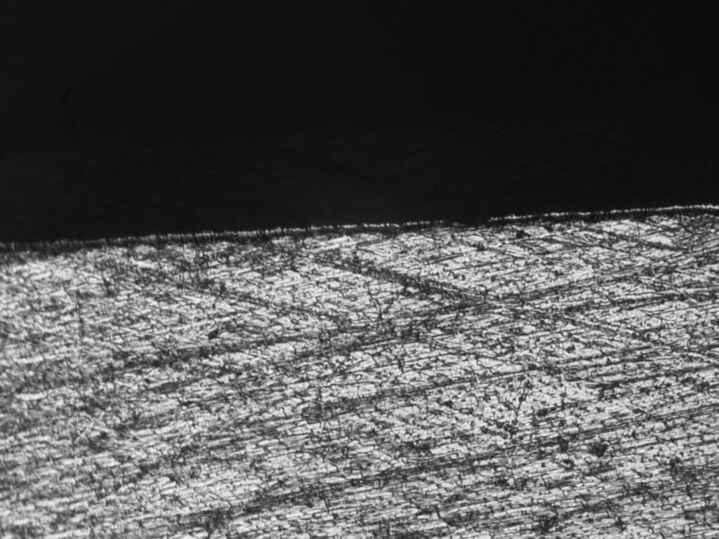 At any rate, plain (mostly iron and carbon with other additives not floating free in the matrix) high hardness irons will take a finished edge off of a washita and leave no perceptible burr, but without having toothiness. Here’s what this iron looked like straight off of india and washita at 150x.