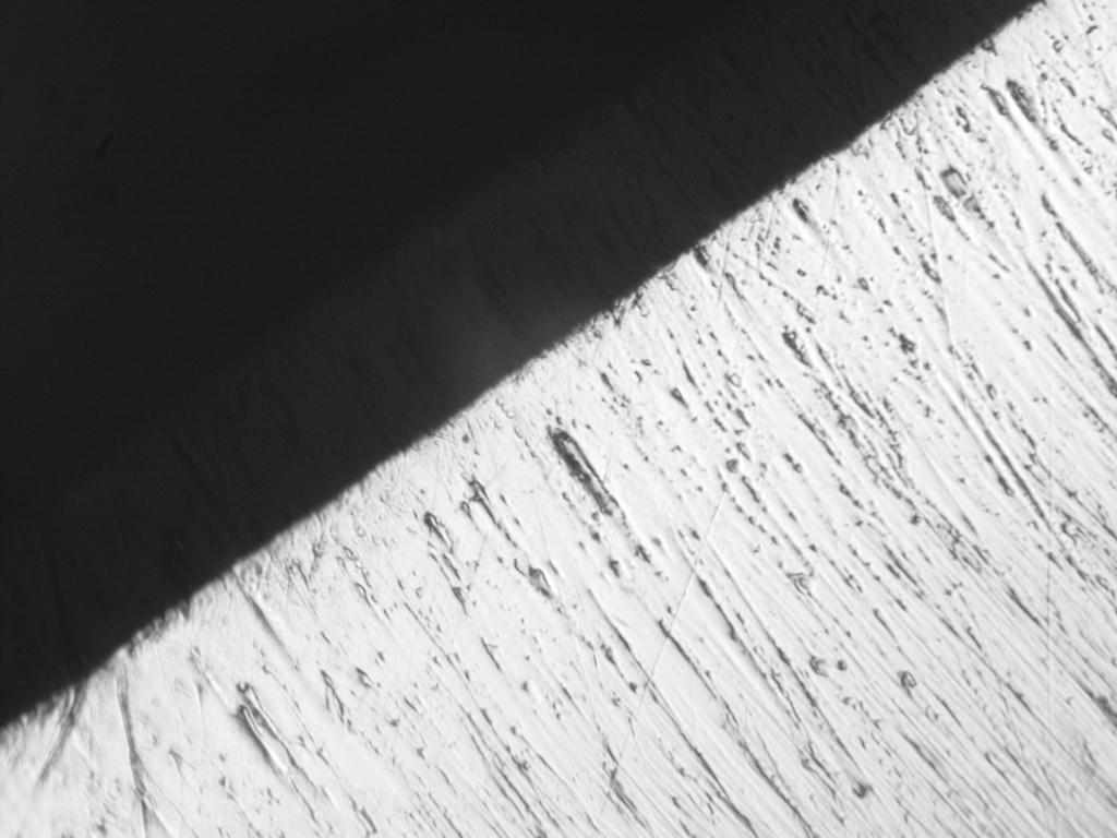 First edge on the rehardened stanley chisel on a washita. Scratches don’t look much different than the stones above (which should be a surprise based on grit charts. Finishing the edge for ten second with a light touch shows an edge even-ness little different from finish waterstones, but the scratches are shallower.