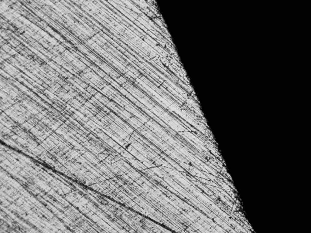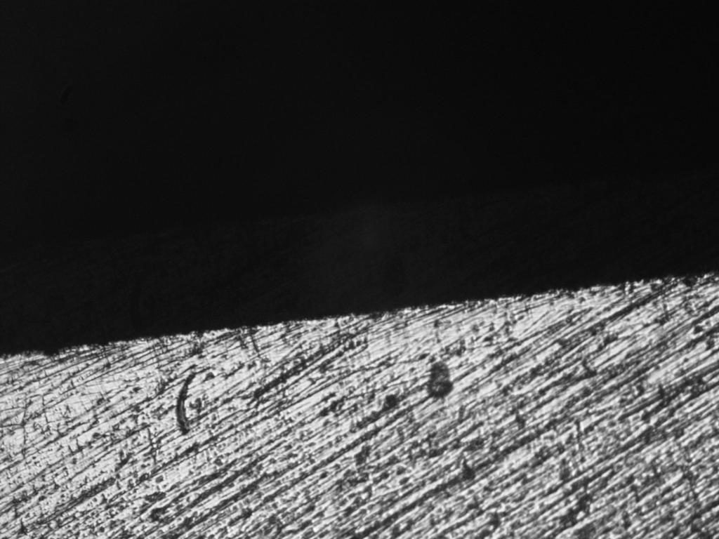 Kitayama stone edge – picture height is 0.019″. Note the scratches are uniform, but wrap around the edge. Not an unpleasant edge, but the stone does one thing and this is it (unless you let it dry and burnish and cease cutting – that works, but the stone needs to be abraded to refresh the surface after that)