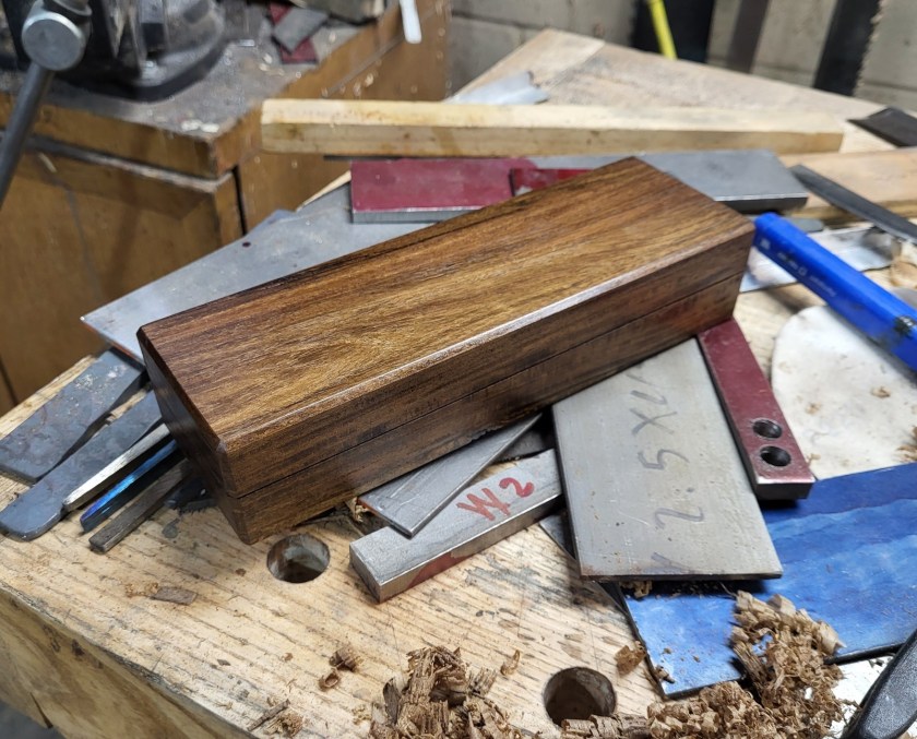 There’s not much end to plane here. If I hate sanding, I hate sanding end grain five times as much. It feels like an activity meant for people with no brain. I also don’t like the look of sanded broken edges, so I don’t do that either. you can plane the bevels on the fresh wood, but it’s faster to use a file or super shear, so the dust you see on the bench top is just what came off of the super shear. This box isn’t think enough for large bevels, and if one were to make a decorative box with them, mahogany would be smarter. It’s more stable, anyway, and five times easier to work.