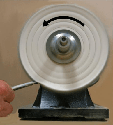3) The last step is what finishes the job. Run the chisel or gouge that you’re learning with into a high speed stitched cotton buff with a 2-5 micron honing media. Do this more steeply than the bevel, buffing the bevel side only. Push your chisel into a stitched wheel – see equipment needed to see examples of a good wheel. Push the chisel into the just for a couple of seconds, but firmly so that you’re getting into the backbone of the wheel.