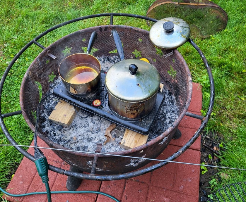 This is my setup – that’s it. Later, the varnish is strained when it cools, but on the left is a pot with oil in it. On the right is (not very instructive), copal from the second cruddy run trying to get hot enough to melt and cook out the impurities.