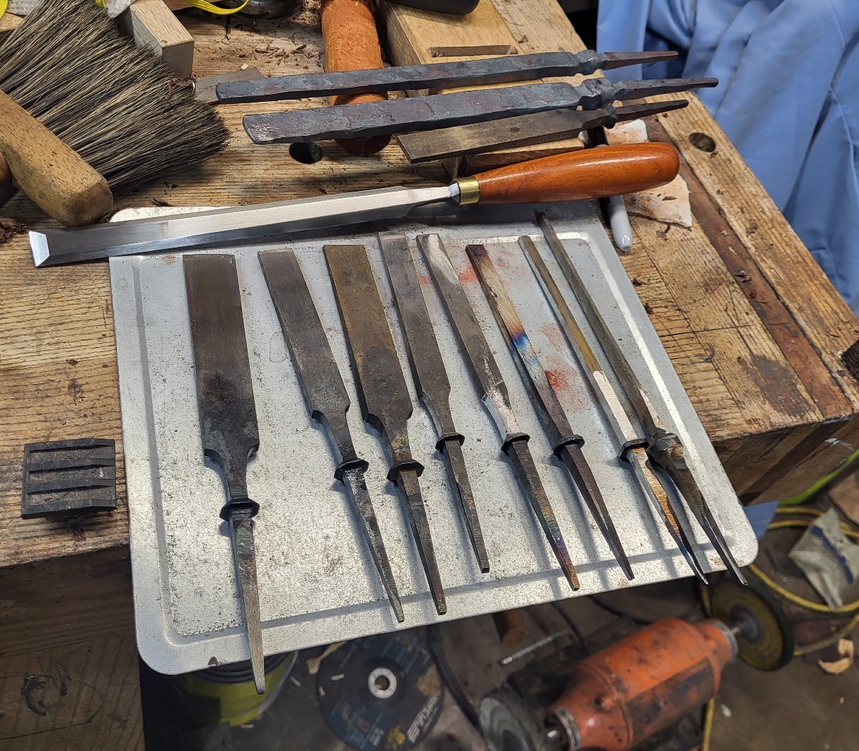 This picture is a little old. All but three of the chisels are completely finished, one of the eight still needs hardening and that and the two not ground need their bevels. I’ve made two extra due to superficial cracks on two of the chisels in this picture. Use of the cam hammer allows one to work very sectionally and keep going for perfect a little too long. Use of a hammer swinging will send you back to the forge a little early every time – which probably explains why i never saw cracks there. If you’re swinging a hammer, you lose interest in trying to move steel at all if it’s not at a temperature where it moves well.