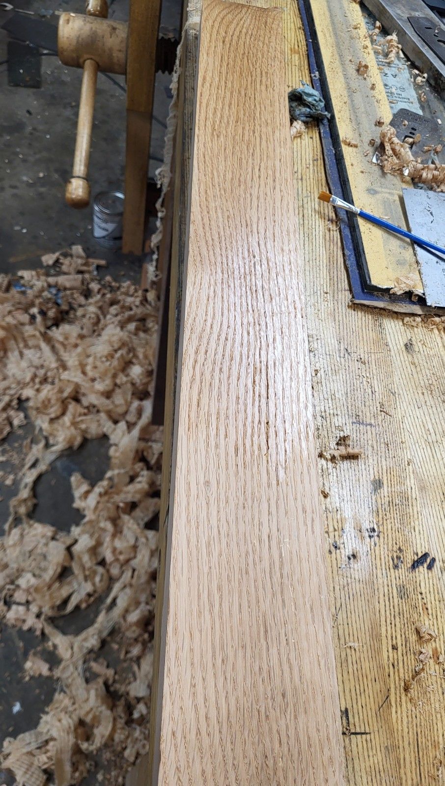 This one was rough, so I planed it, but I spotted these laying in the upper part of one of the two garages that dad has (not a great situation for a parent losing their memory and wanting to keep everything! Two multi-floor garages)…the only thing dad has kept after the junk man went through is some original doors to the house that are still in good shape – just not wanted – and a stack of these. Oh, and the shiny bits at the top of it. out of curiosity, I want to apply varnish to it and see how it looks, so it got a first coat of varnish on the end.