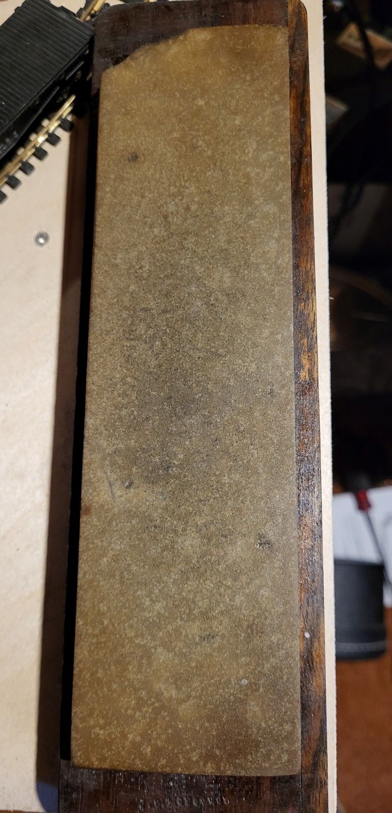 Top right is a middle india type stone, also 8x3x1 in size, or thereabouts, and it’s marked 300 vs. the white stones #3000. it is much finer than a norton fine india, so the number on it isn’t meaningful in grit terms that we’re used to. It was, perhaps, relelvant to the old grit scale where 1200FF or something like that was a barber hone abrasive.