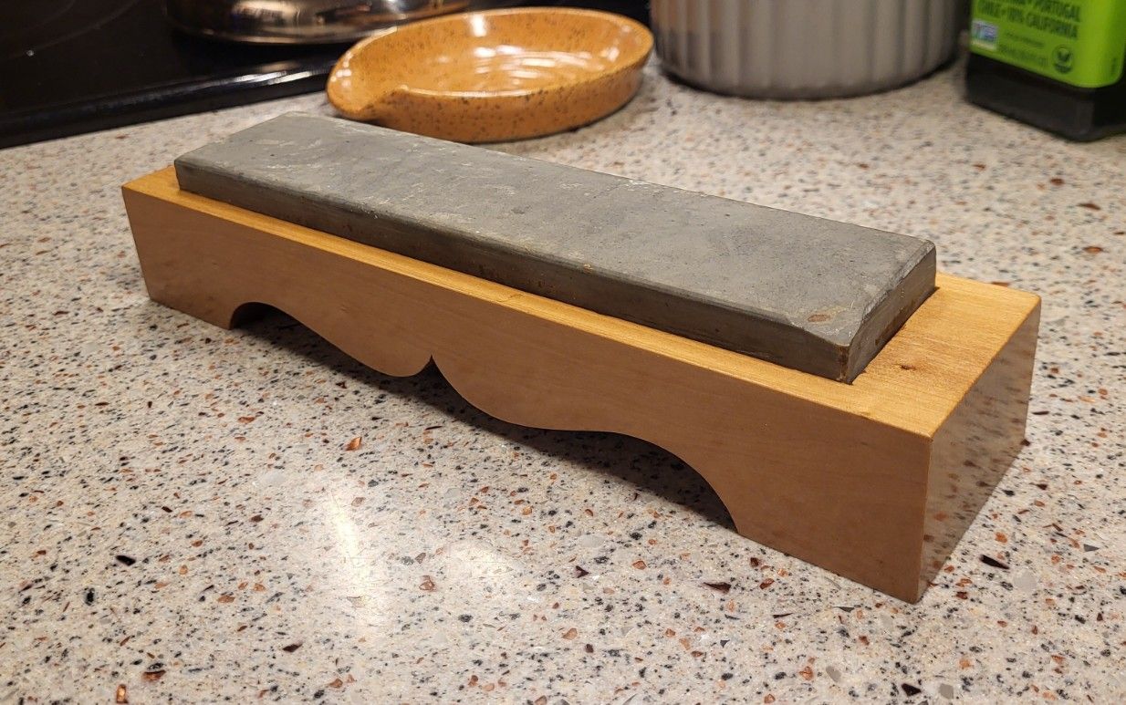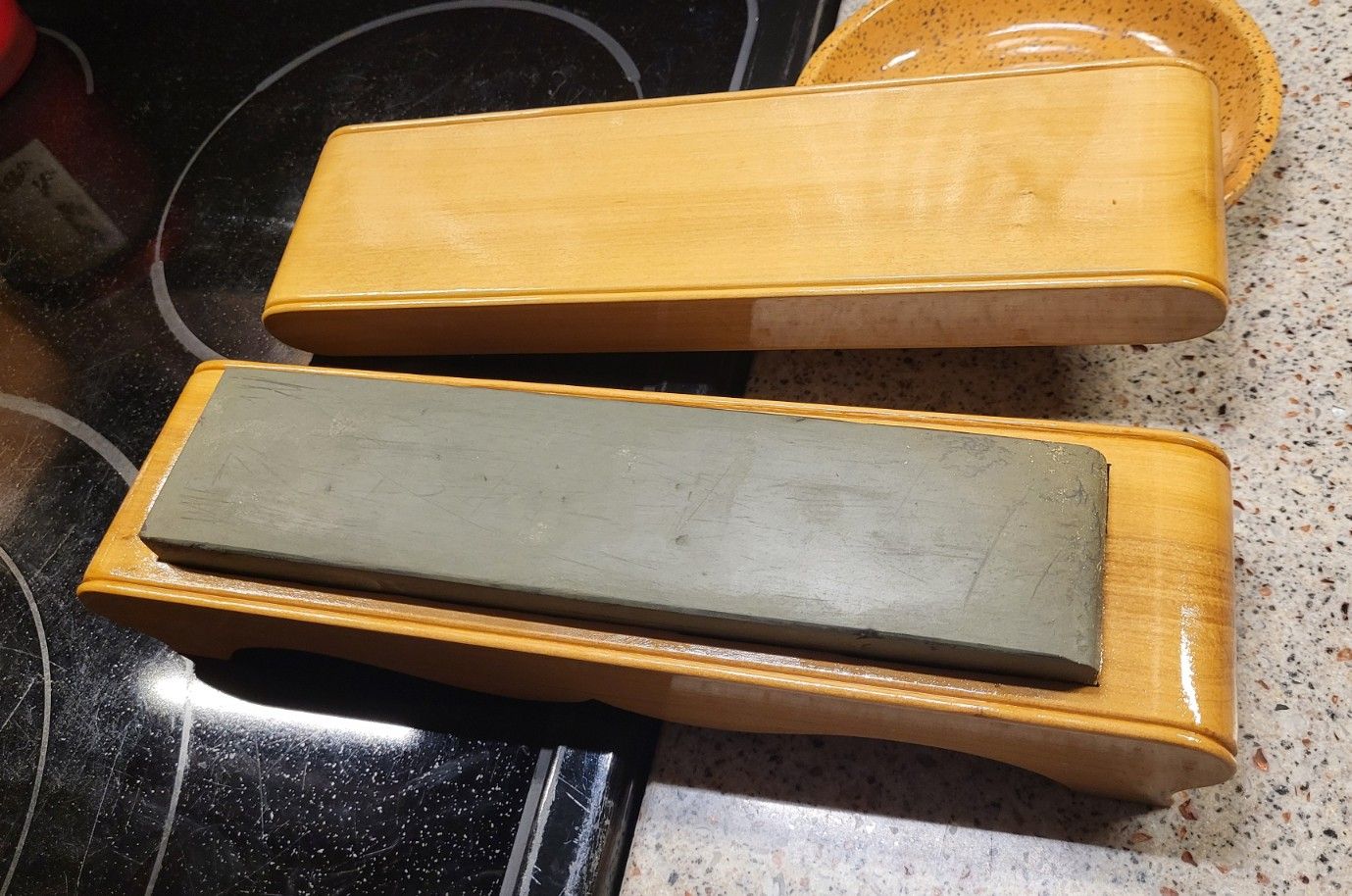 I mentioned in the last post that I wanted to explore something more interesting with the boxes, like a furniture-like shape. I thought this would look like a couch without the back. Which my daughter came down and quickly blurted out “that’s an ottoman”. Which made me also realize that I missed the opportunity to do this style of box with one of the turkish oilstones. The two I have are permanently seated in something already and they are very irregular in shape, so that ship has sailed.