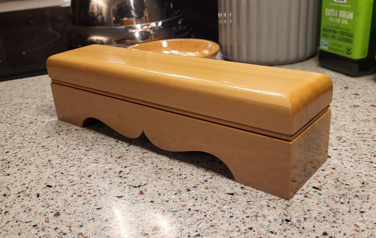 The ends are rounded over and the bead goes all the way around. I don’t scratch bead much and this curve on a wood that’s fairly hard isn’t trivial, so I had to sort of figure it out. There’s one other box that appears to be made of mahogany with curved ends online and when I first decided to try this, i took a closer look at it and the beads on the ends are pretty shitty. That box has interesting little carved details, and the maker of it was likely never intending to show pictures online. The trick to getting a beading blade to work across this was to sharpen the bottom of the profile to a point, otherwise it would just ride on the wood and not sink in.