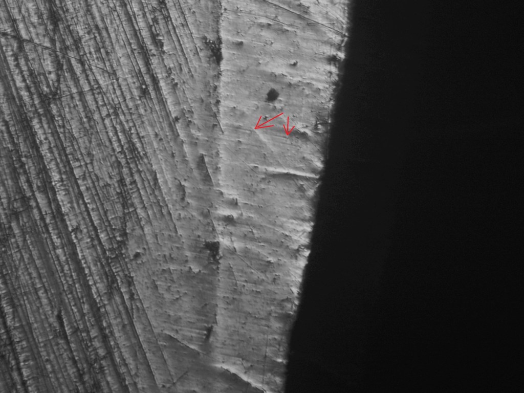 Elimination of Defects in Routine Sharpening: Good with good heat treatment. A skilled user is unlikely to need to “stop and grind nicks” before an edge is dull.